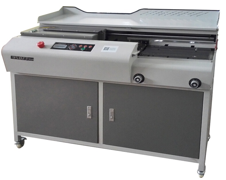 1. Intelligent LCD display, simple operating panel; 2. One glue roller even glue applying; 3. Paper scrap collection bag; 4. Convenient work table also be used as machine cover after work; 5. Easy scoring online(950Z5 and 950Z8); 6. Vertical cover clamping; 7. Milling cutter with changeable notching knife; 8. Adjustable height of cover clamping station.